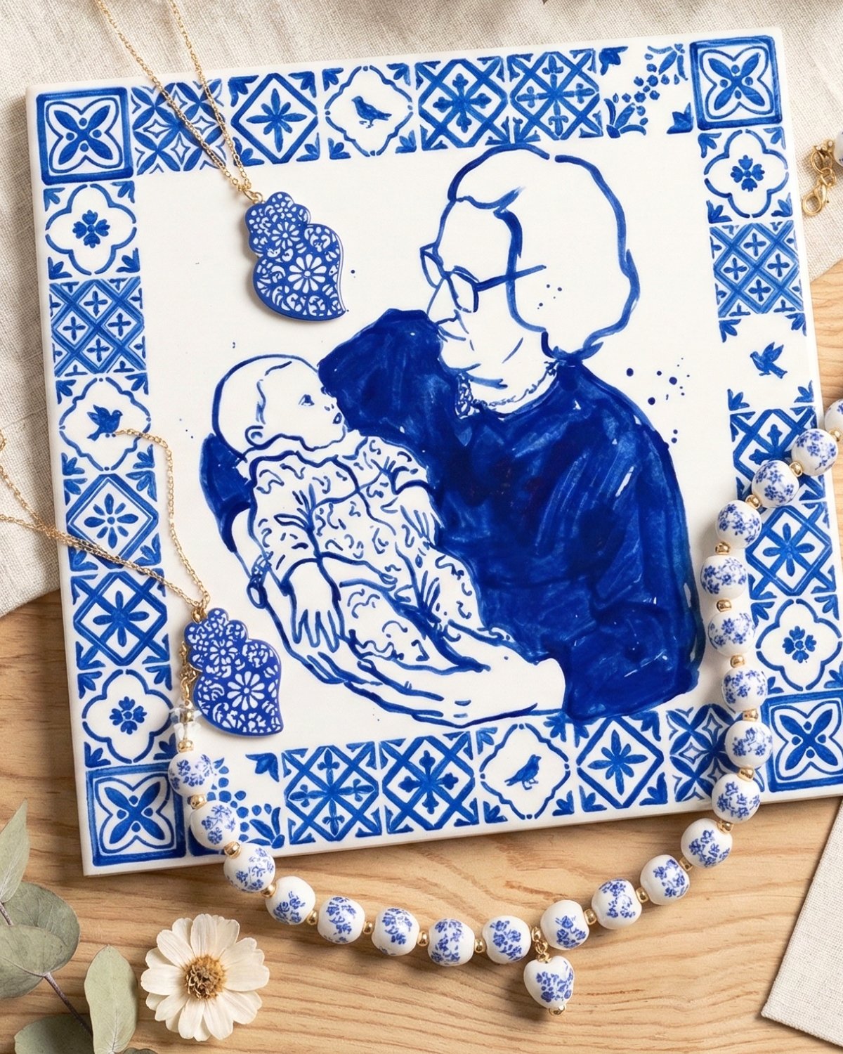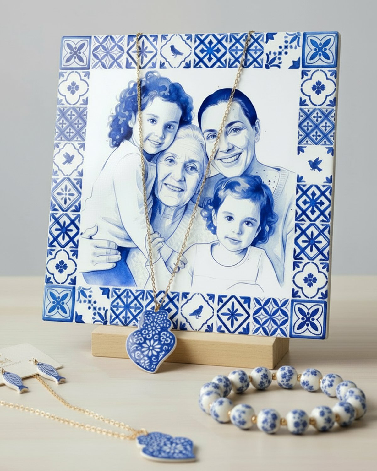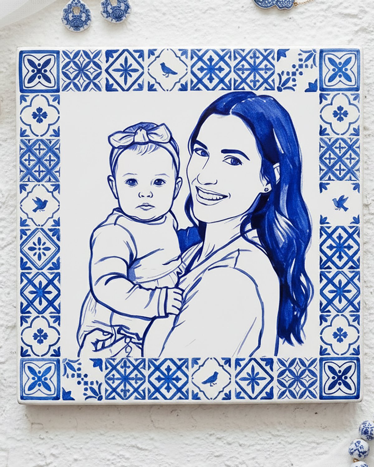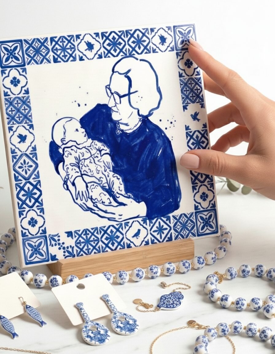 Azulejo personalizado com pintura feita a partir da foto, em estilo tradicional português. O azulejo tem a medida de 20x20cm. É uma prenda muito gira para oferecer na Páscoa, Dia da Mãe, Avós. Inclui a base em madeira e a caixa com o mesmo tema.