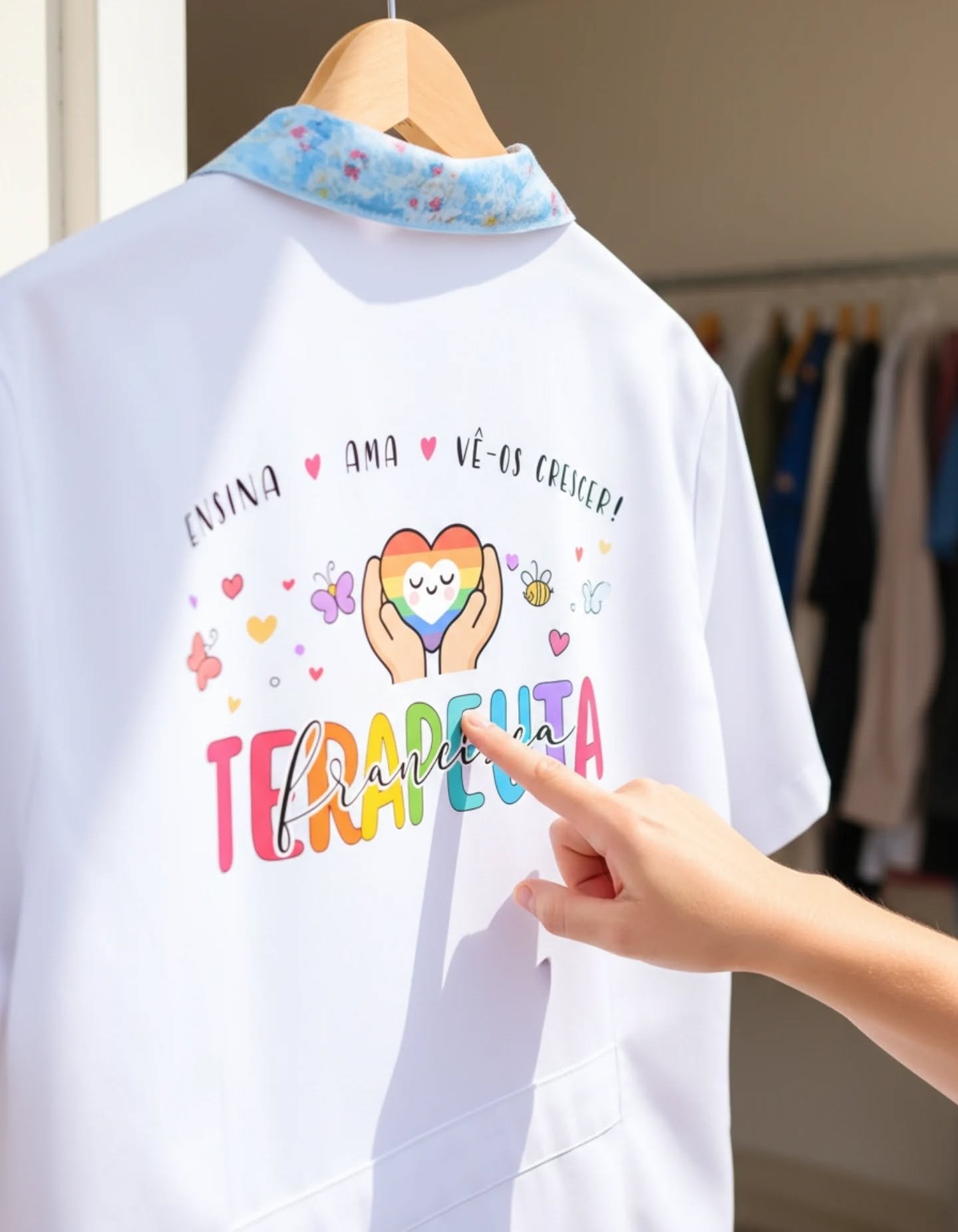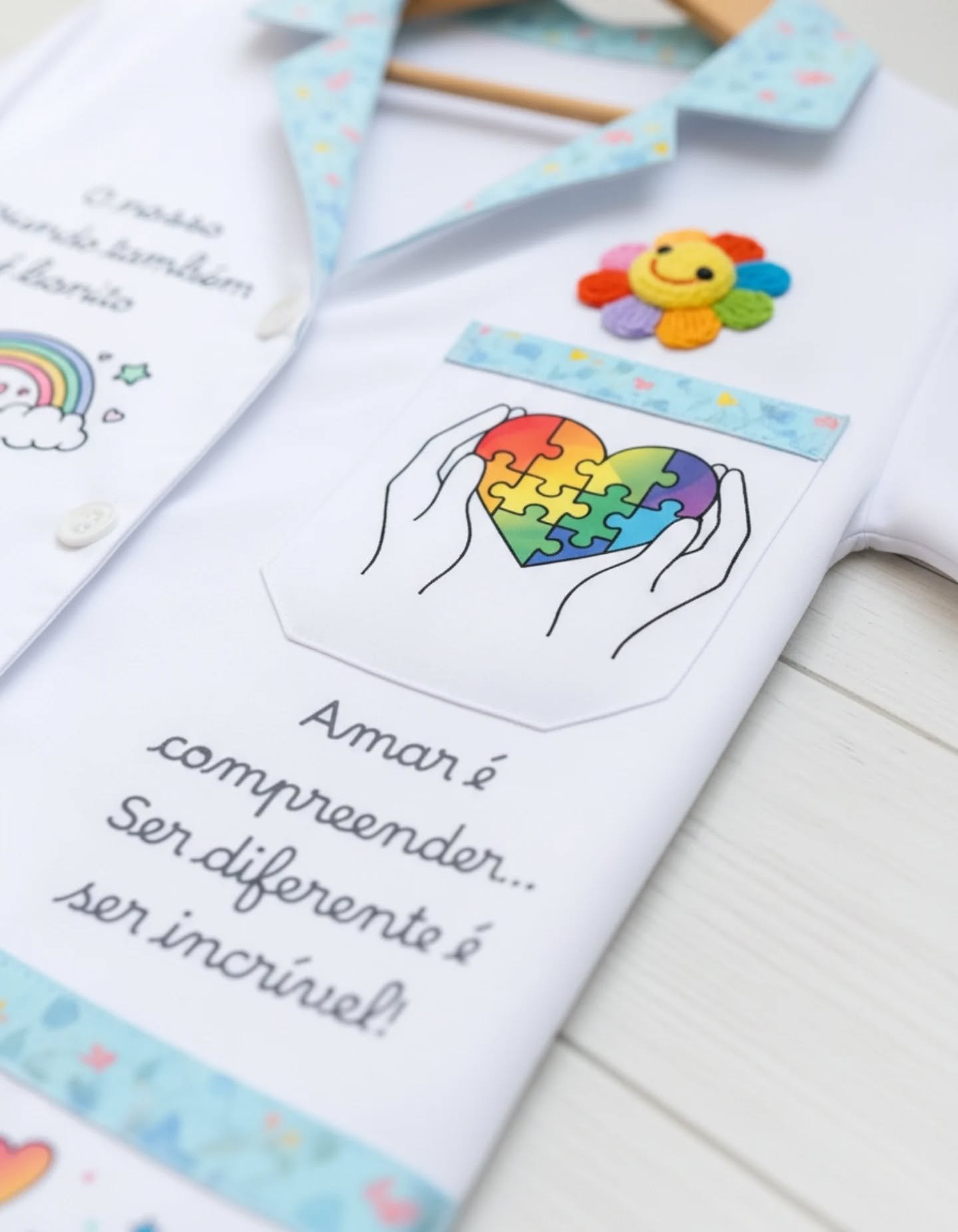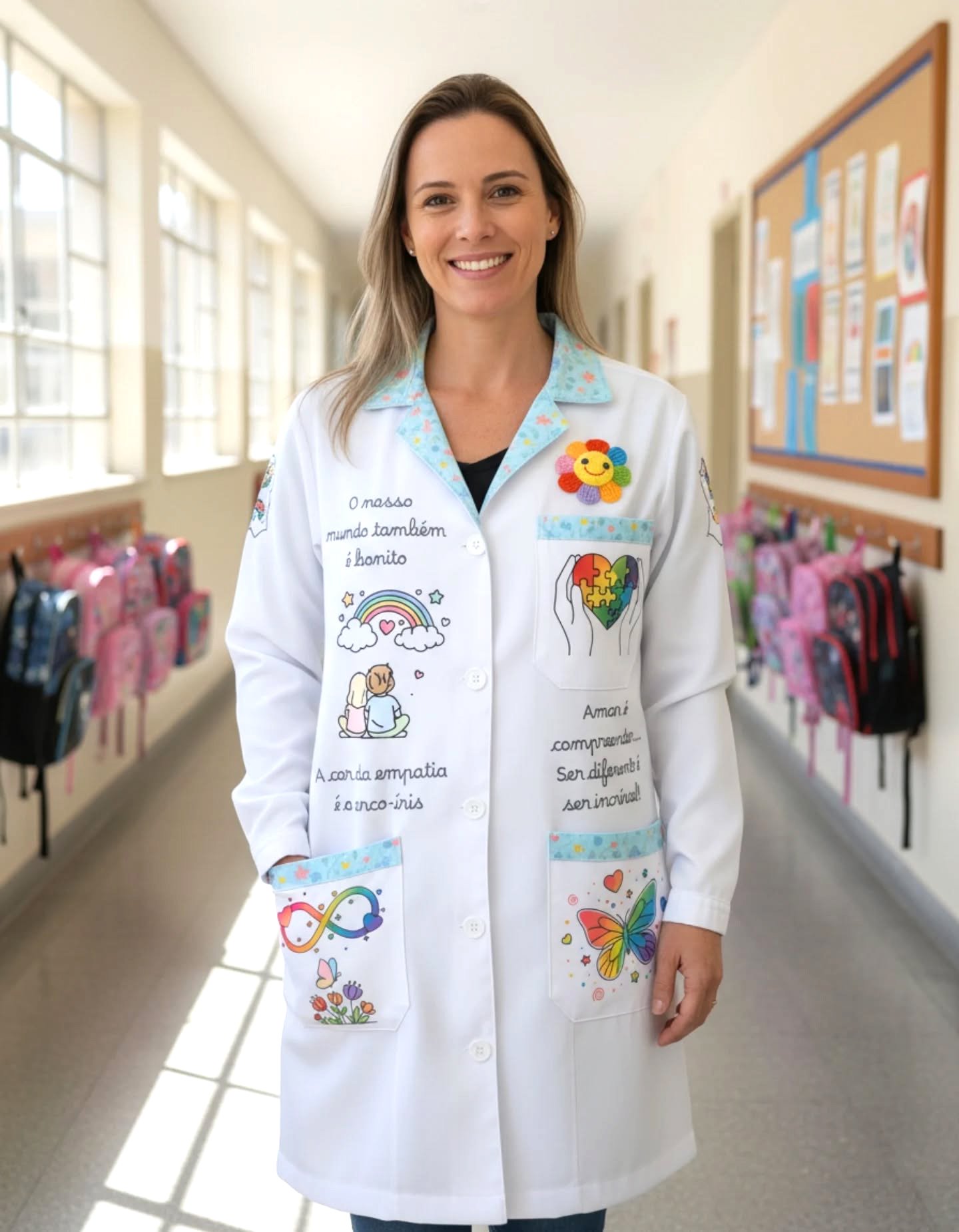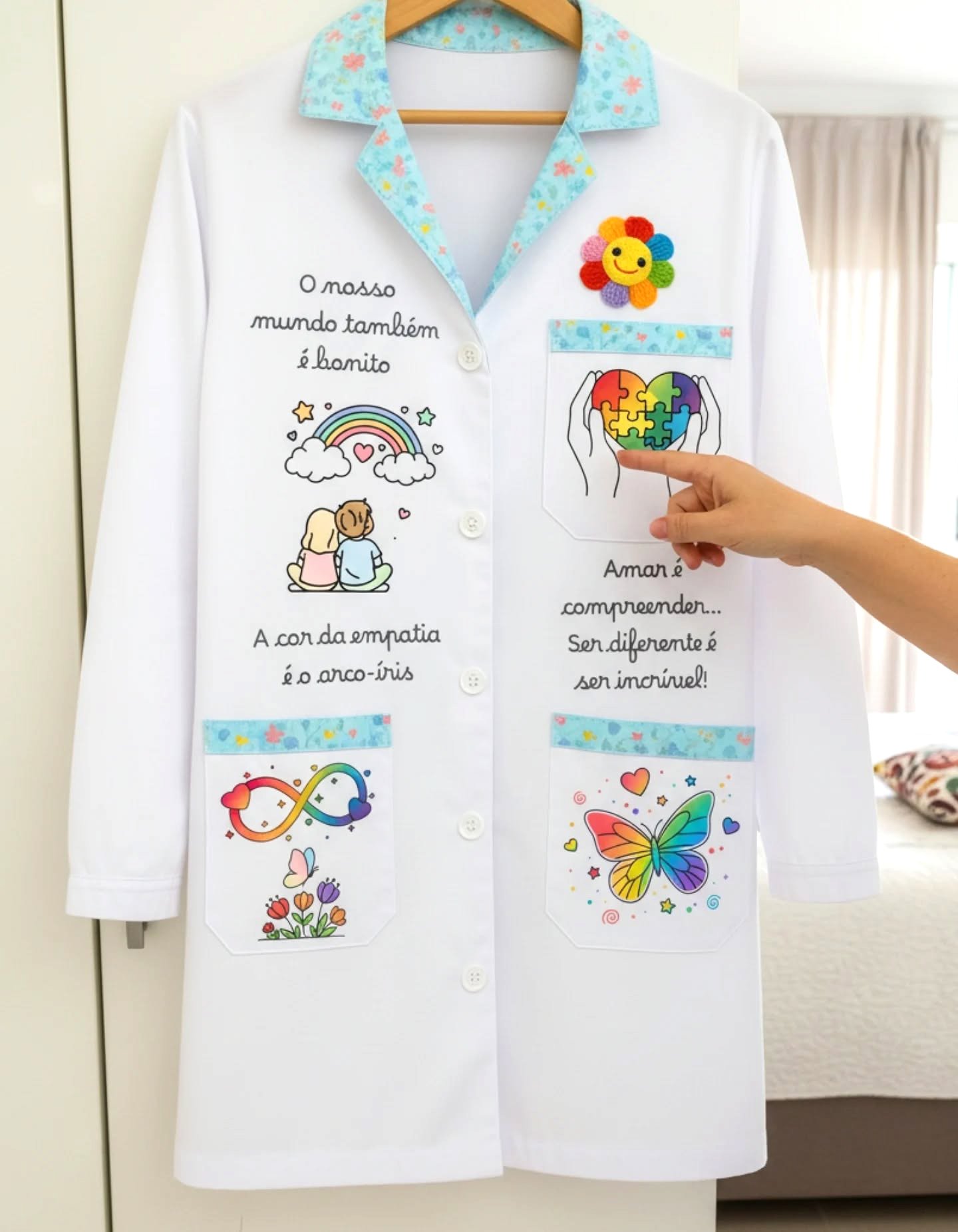 Bata maravilhosa para Terapeuta ocupacional, com o tema do Autismo. Na frente tem várias ilustrações simbólicas e mensagens alusivas e atrás é personalizada com o nome da pessoa. O padrão colorido no colarinho e bolsos pode ser personalizado (azul, rosa ou branco)