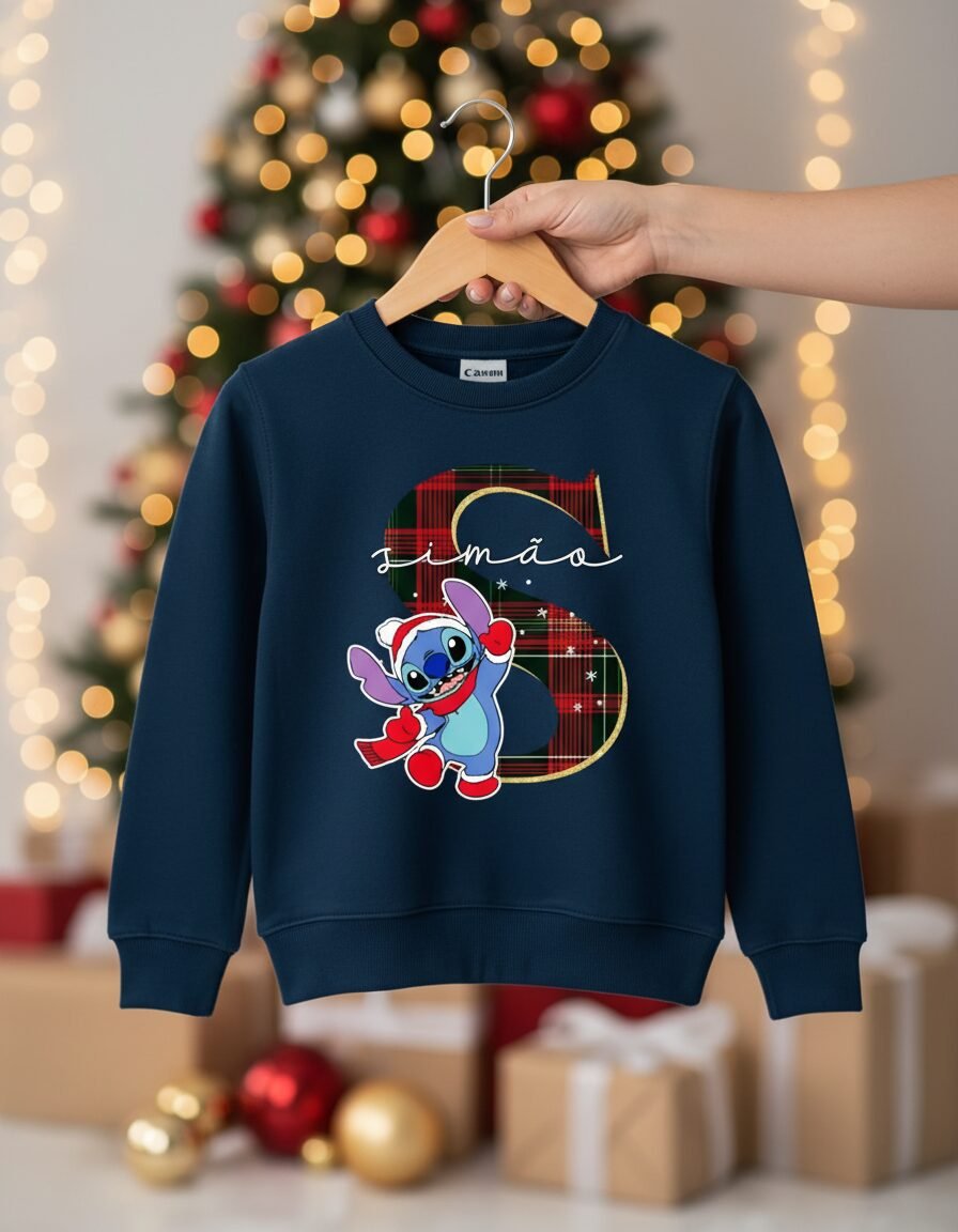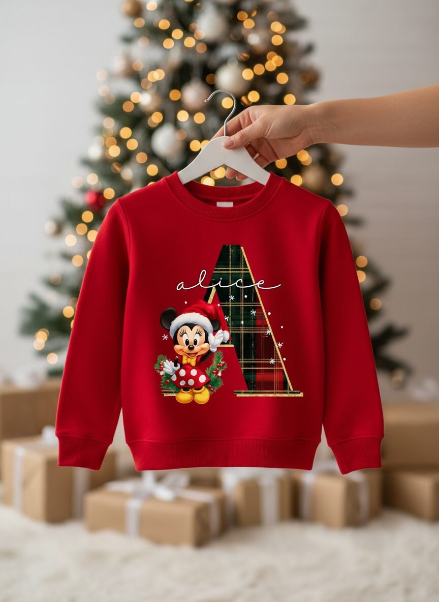 Camisola de Natal com nome, inicial e bonequinho favorito (Mickey, Minnie, Stitch, etc). Camisolas cardadas, muito macias, confortáveis e quentinhas.