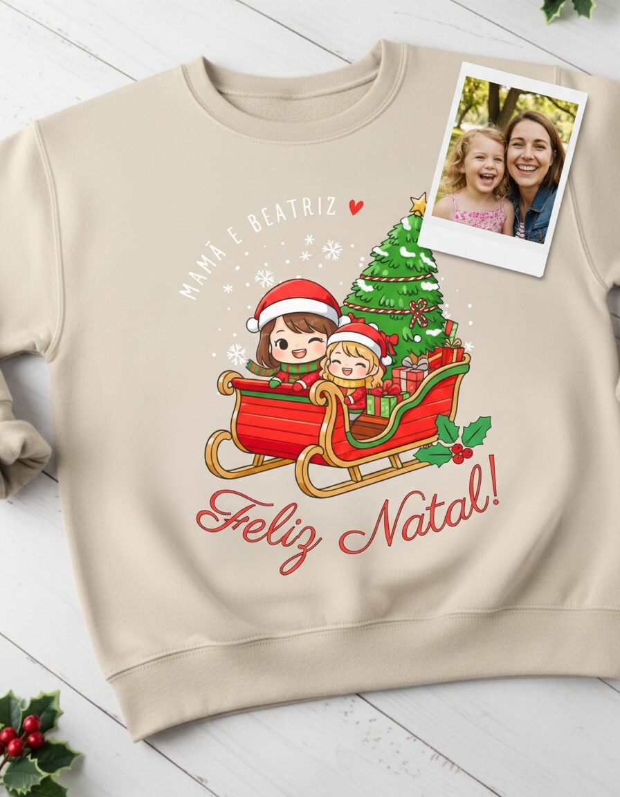 Camisola de Natal divertida com desenho 100% original com os bonequinhos da tua família num trenó! Cada ilustração é feita a partir das caracteristicas da pessoa. Camisolas cardadas, muito macias, confortáveis e quentinhas.