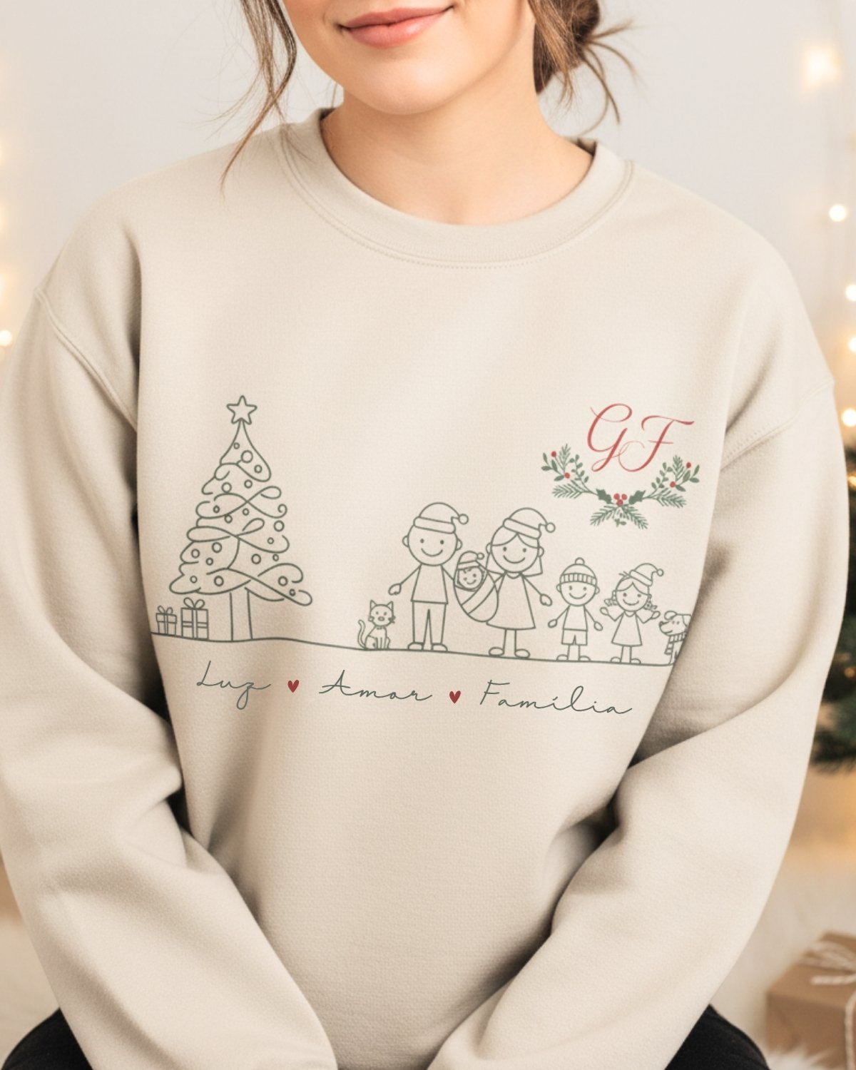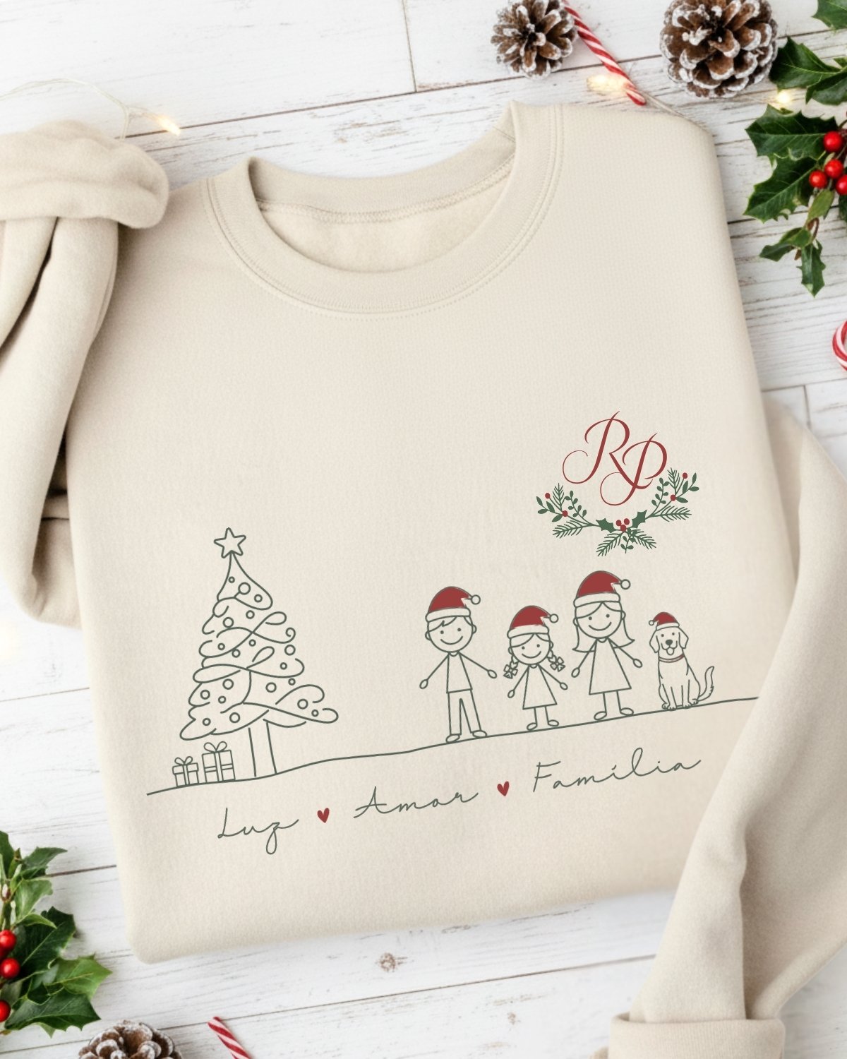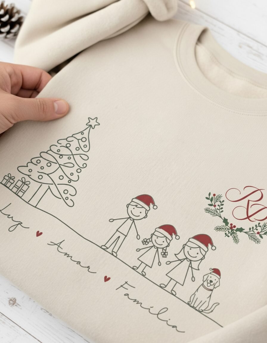 Camisola de Natal personalizada com a tua família desenhada em bonequinhos de criança super fofos. Muito elegante para vestir na sessão de Natal, ficam maravilhosas nas fotos! Inclui um monograma com as iniciais da família. Camisolas cardadas, muito macias, confortáveis e quentinhas.