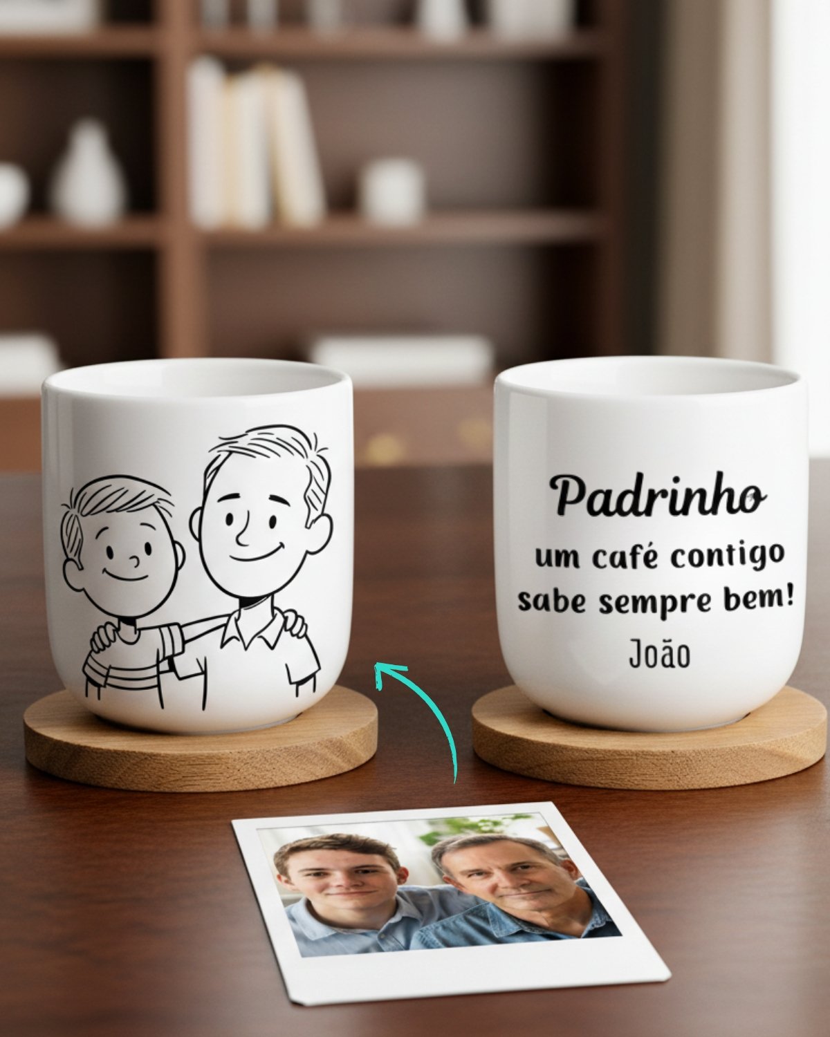 Conjunto de 2 chávenas de café com bonequinhos personalizados (desenhados a partir da foto enviada) e uma frase dedicatória. São uma prenda muito gira para oferecer aos Padrinhos mas também Avós. Cada chávena inclui a base de madeira.