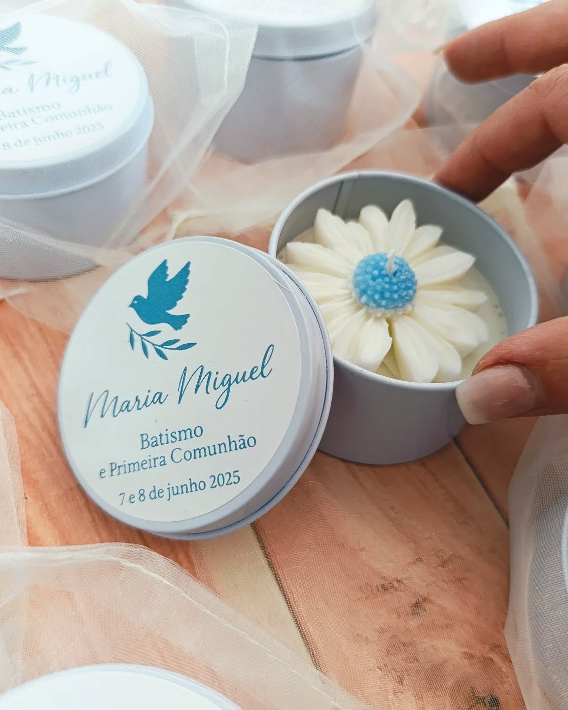 Velinhas perfumadas para Lembranças de Batismo. Personalizadas com nome, data e as cores do Batizado.