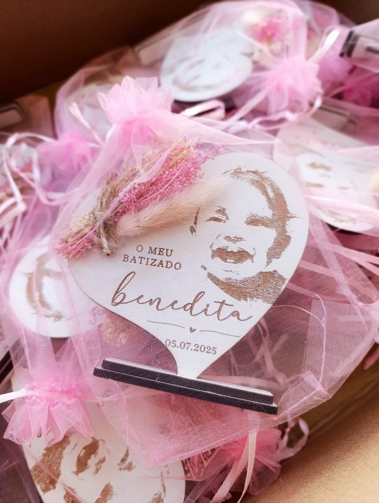 Lindas Lembranças de Batizado em madeira com fotografia gravada. Podem ser decoradas com flores ou símbolos a combinar com o tema do Batizado. Tamanho 10x10cm