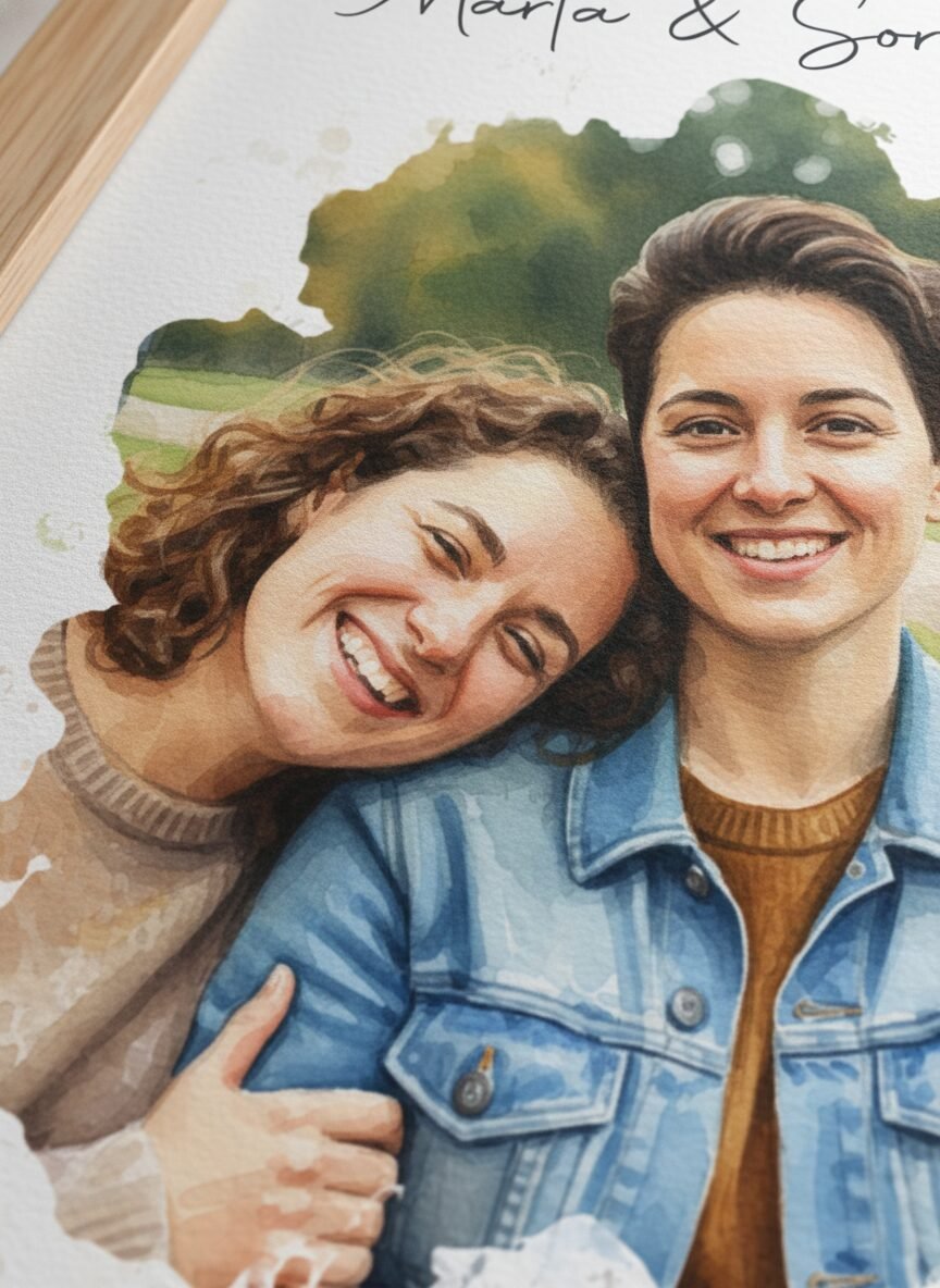 Moldura personalizada com texto e fotografia em efeito aguarela. A moldura tem várias medidas, 21x30cms, 30x40cms ou 50x70cms.