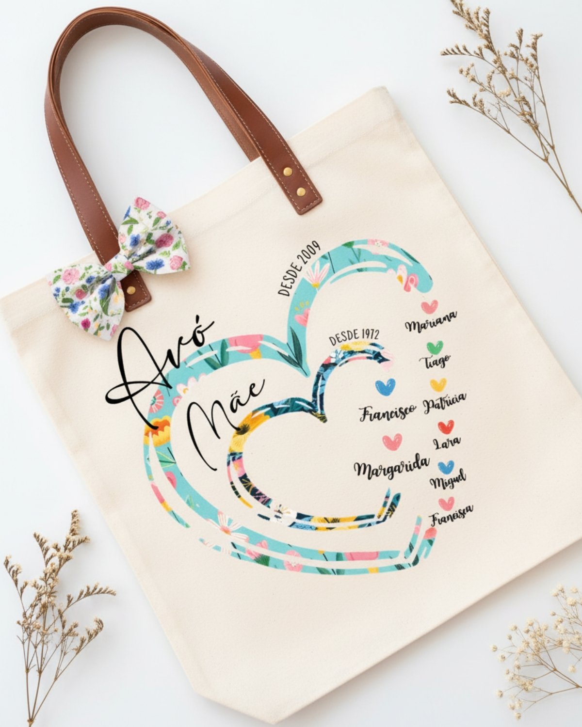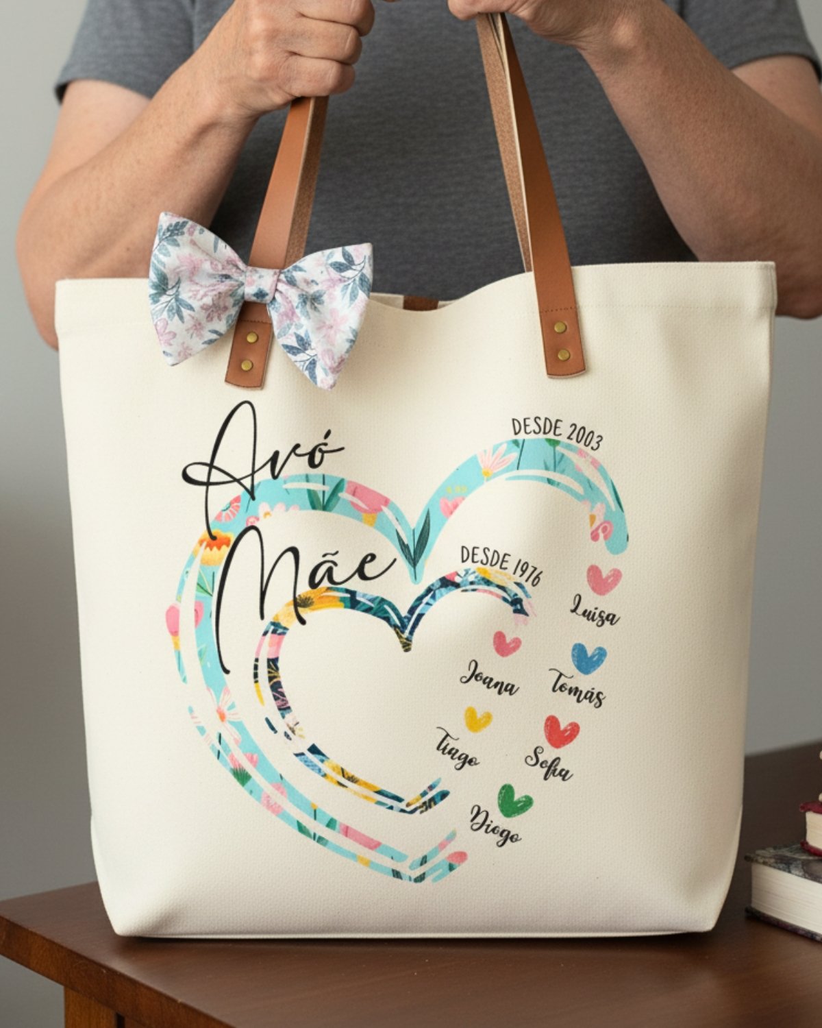 Sacolas Tote bags personalizadas para a Avó com corações e nomes. Sacolas 100% algodão com alças. Medida 39 x 36 cms